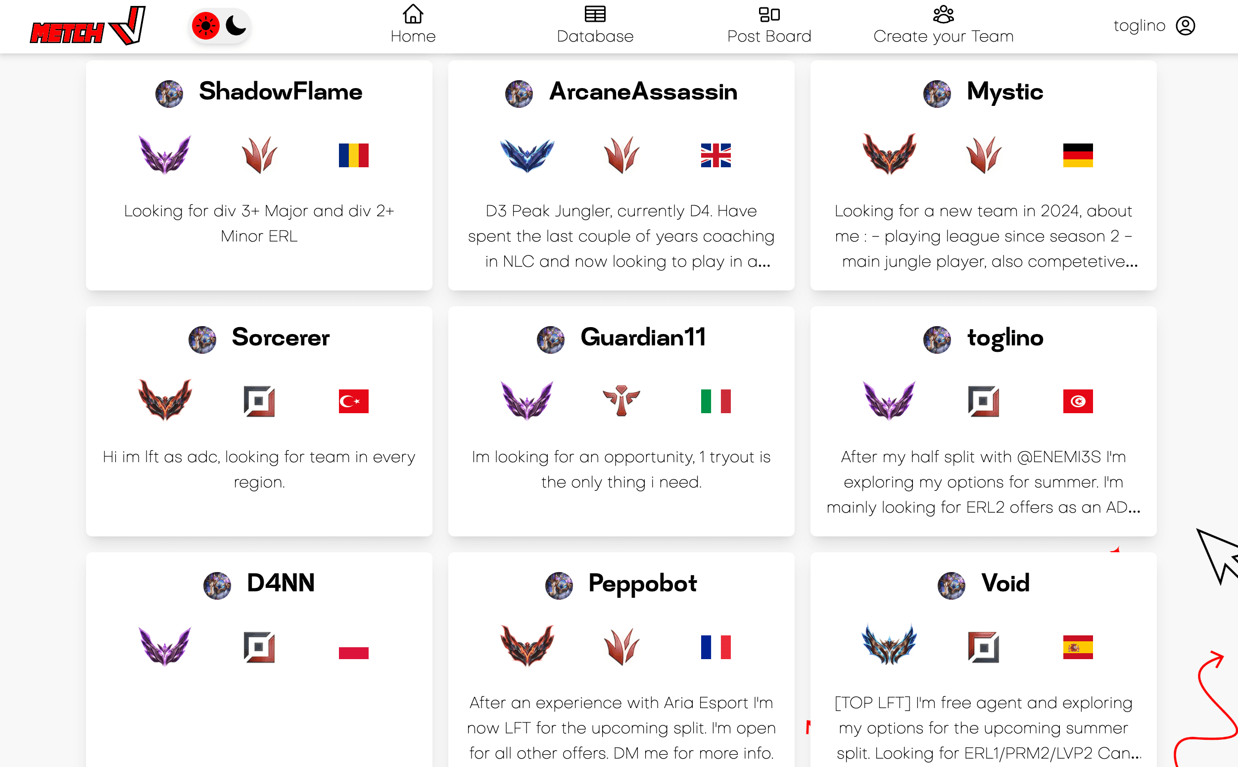 Discover free agent players/staff members or see which teams are seeking a profile like yours.